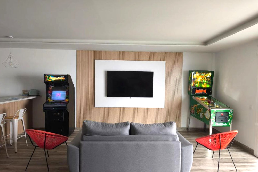 La casa destaca por su amplia oferta de entretenimiento: pinball retro, máquina arcade, futbolín, arco, juegos de mesa, zona infantil y equipamiento para juegos al aire libre. En verano, la piscina y la zona exterior permiten disfrutar de momentos relajados en un entorno privado.