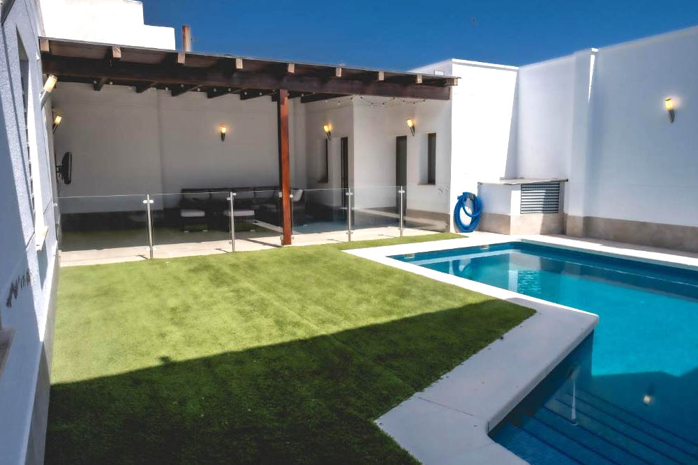 La casa dispone de piscina exterior privada de temporada, terraza, jardín y amplias zonas interiores. Cuenta con cocina equipada, Wi-Fi gratuito, aire acondicionado, calefacción y zona de estar con TV. Su amplitud y distribución la convierten en una opción muy cómoda para estancias de varios días.